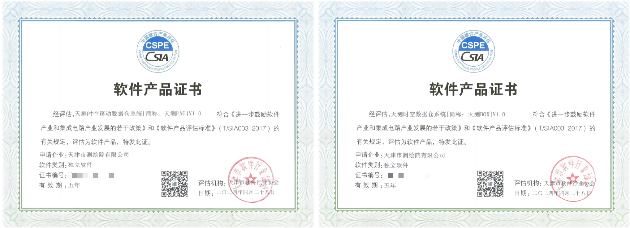 天津市测绘院有限公司自主研发的天测时空系列产品“天测时空数据仓系统(以下简称:天测BOX)”“天测时空移动数据仓系统(以下简称:天测PAD)”获得软件产品证书,得到软件技术领域权威认证。